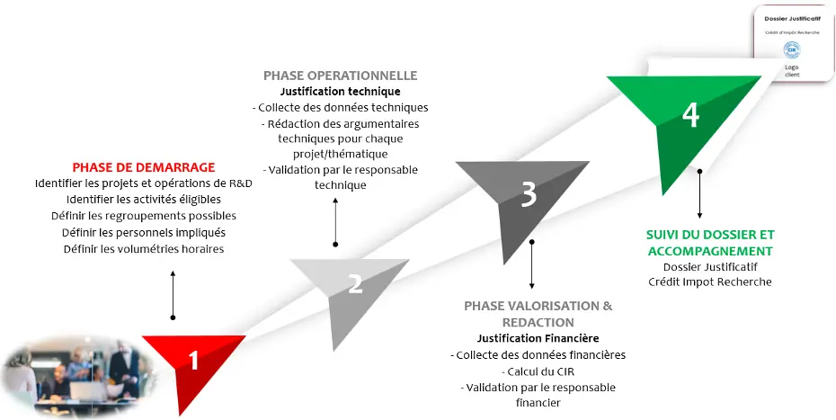 Pour bénéficier du CIR, vous serez d’abord, avec nous, en phase d’audit, période pendant laquelle vous préparez les projets que vous allez ensuite nous présenter. Nos consultants en financement de l’innovation vous apporteront leurs connaissances et leur expertise en matière de Crédit d'Impôt Recherche afin de sécuriser et de valoriser de manière exhaustive vos dépenses de R&D.